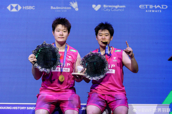 此外,中国队还收获了女双冠军。头号种子刘圣书/谭宁在开场落后的情况下,首局上演逆转,以21比18、21比12再胜4号种子白荷娜/李绍希,本赛季参加三站比赛全部登顶。两人在首夺全英赛冠军的同时,也解锁了全部四站超级1000级别赛事冠军。同时,这也是国羽女双自2019年陈清晨/贾一凡夺冠后,再次在伯明翰登上最高领奖台。