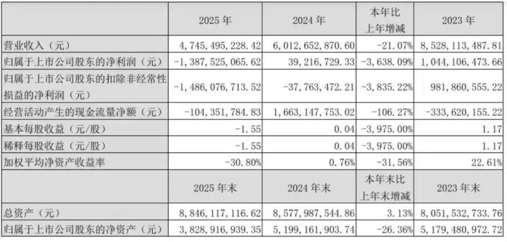 2025年该公司营业收入47.45亿元,同比下降21.07%;归母净利润亏损13.88亿元,而上年同期还是盈利3921万元。